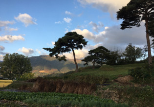 지리산의 연봉들이 펼쳐져 있고 마을앞 삼정산과 뒷산 수청산 , 좌청룡엔 백운산, 우백호엔 마을당산이 있고 그 뒤로 지리산 서부능선들이 펼쳐져 있습니다.